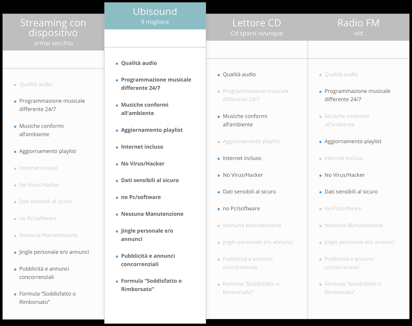 Una musica soffusa tra le portate di una cena indimenticabile, un ritmo vivace per rinfrescare una divertente pausa in piscina, dolci melodie per farsi cullare dal relax di un massaggio. Ubi Sound offre alle strutture alberghiere la possibilità di avere una radio personalizzata, che accompagni il cliente in ogni ambiente e attività. Spot commerciali, informazioni di servizio e jingle: il palinsesto proposto da Ubi Sound è “cucito” su misura per il brand, curato dai migliori music designer italiani e basato su selezioni distinte in base a fasce orarie, stagioni e festività.